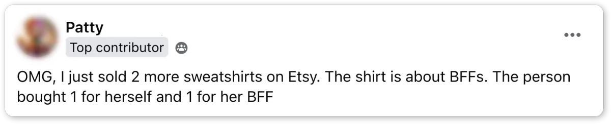 "I got my first sale (other than my mom, lol)!! Whoop!! A friend of mine ordered two shirts! Then later this evening I had another one from someone I don't even know from another state!! What an awesome day!"